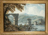 Watercolour and bodycolour painting, partially varnished, on four sheets of joined paper, The Ruins of Augustus's Bridge over the Nera at Narni, by Abraham Louis Ducros (Yverdon, Switzerland 1748 ¿ Lausanne 1810).The bridge of Augustus, of which only one arch and the other buttresses remain, carried the Via Flaminia across the Nera near Narni.